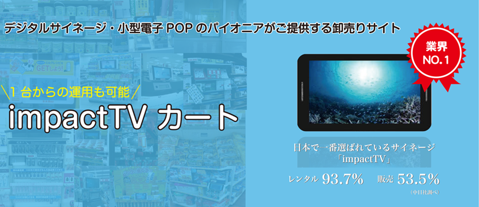 「impactTVカート」は国内シェアナンバーワンの小型デジタルサイネージ専門の通販サイトです。大手メーカーの導入事例も多数。高品質なデジタルサイネージを1台から購入いただけます。極小・軽量の3型から、定番の7型、エンドや催事向けの19型、さらに大型モニタ取付型のメディアプレイヤーまで、幅広いラインナップから売場にぴったりの製品をインターネットで簡単にご注文いただけます。お見積りもWEB上で簡単に発行でき、素早く料金の比較・検討ができます。