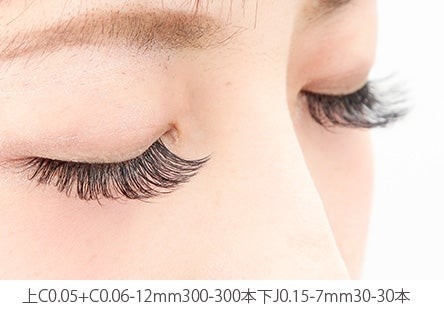【ボリュームラッシュにした場合】0.05ミリや0.06ミリを使用し、基本を何本の束にするかを決め、1本1本のまつ毛に対してカスタマイズし装着することにより、アイライン効果を出しつつより自然に上品に仕上げることが可能。