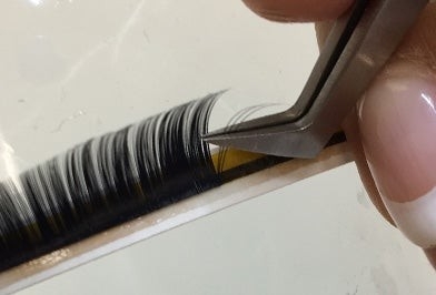 地まつ毛の状態を見極め、シートタイプのエクステから必要な本数をつかみ、一度手前に倒し、また戻し広げます。
