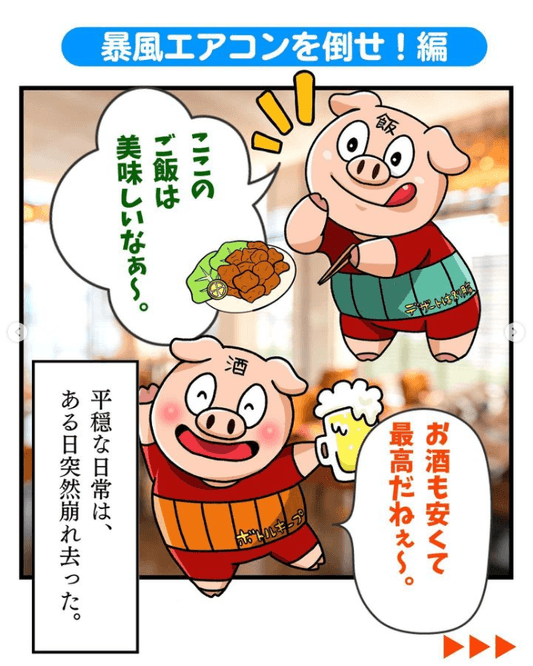 ロバの「テンポ」とブタの「酒」と「飯」の三匹が、飲食店で起きる設備トラブルを次々と解決していくマンガコンテンツ。名作マンガのオマージュらしきシーンもあり。