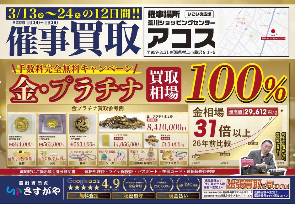 買取専門店さすがやは、2026年3月13日(金)〜3月24日(火)の12日間、荒川ショッピングセンター「アコス」にて、期間限定の買取催事(査定イベント)を実施いたします。