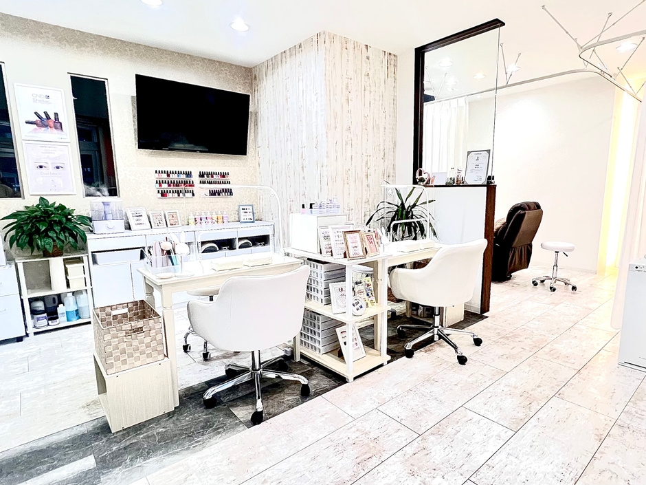 白を基調としたやわらかい光とアロマが香る空間で、ネイルやまつ毛美容を楽しみながらくつろいで過ごすことができます。