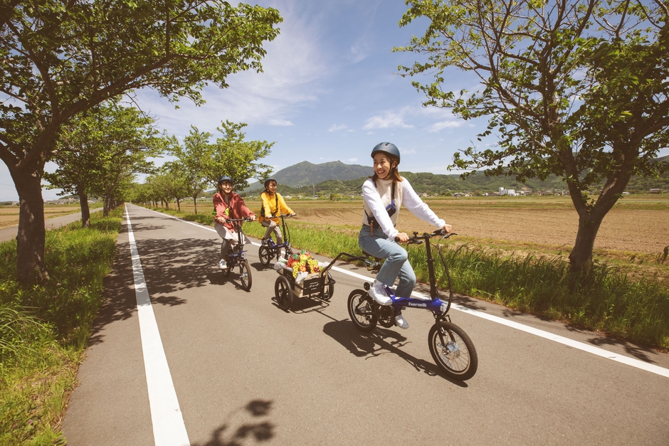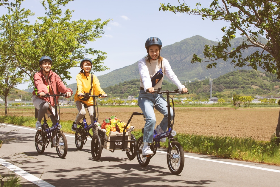 電動アシスト付きスポーツ自転車E-bikeでスイスイ移動できます。E-bikeとは電動アシスト機能がついたスポーツ自転車のことで、軽いペダリングで時速20km前後の速度を保ちながら走ることができます。体力に自信がない方でも、長距離や上り坂を楽に走ることが可能。軽快な走りを楽しめ、たくさんフルーツが乗ったトレーラーも楽に運ぶことができます。