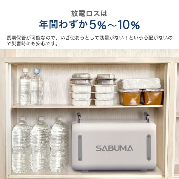 SABUMA S2200は、大容量2,258Whでありながら放電ロスが年間わずか5〜10%程度のため、電池残量が減りにくく長期保管が可能です。また、パススルーモードで機器に給電することで、停電時に止まってしまうリスクが軽減されます。