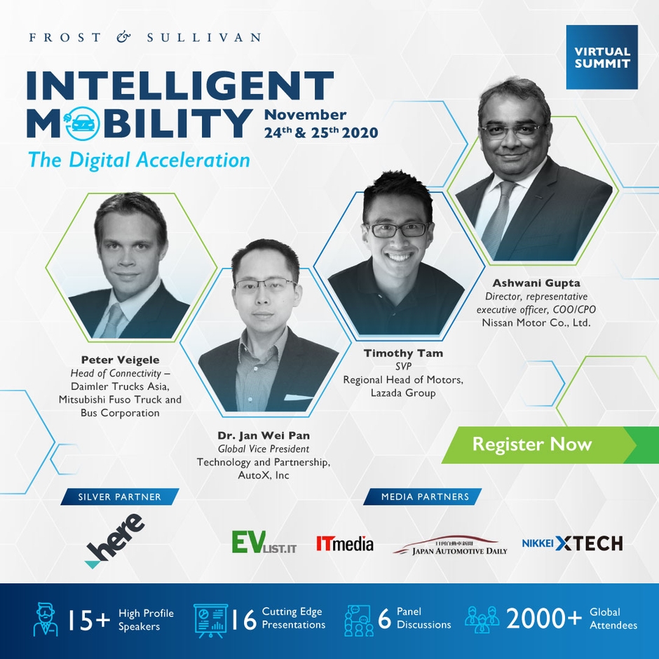 モビリティ業界の様々な領域におけるデジタル化の動向を理解するための場として、「加速するデジタル化」をテーマとしたフロスト・アンド・サリバンインテリジェントモビリティ2020を開催します。このフロスト・アンド・サリバンの旗艦イベントは今年オンラインへ移行し、2020年の11月24日&25日の2日間にわたって開催され、示唆に富むプレゼンテーション、パネルディスカッション、ネットワーキングセッションなどを提供します。インタラクティブなオンラインプラットフォームでは、スピーカーセッションの会場やパネルのテーマに関するリソースライブラリ、ライブチャット機能で訪問者とコミュニケーションが取れるスポンサー用ブース、イベントのテーマに関するダウンロード可能なコンテンツなどを通して、参加者に様々なバーチャル体験を提供します。