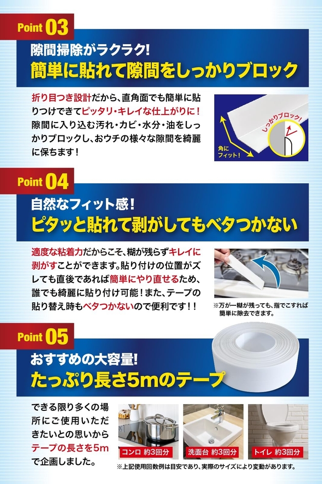 キッチンのコンロ周り、洗面台、便器まわりなどの隙間にもぴったりフィット。
