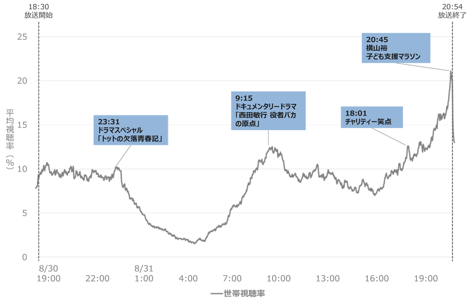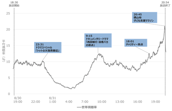 19:00から終盤にかけて再び視聴率は上昇し、20:45に横山裕さんが子ども支援マラソンのランナーとして走るシーンでは番組内で最も高い21.1%を記録しました。
