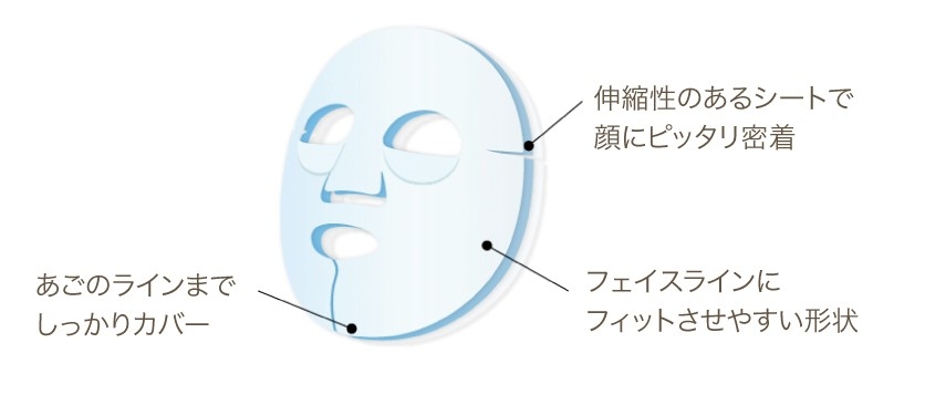 伸縮性のあるシートが顔にピッタリ密着し、あごのラインまでカバーすることで、保湿美容液を角層まで浸透させます。