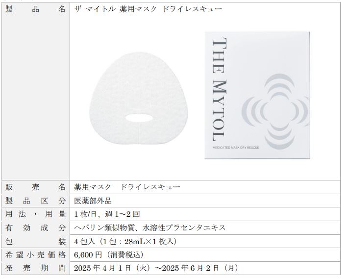 大正製薬株式会社[本社:東京都豊島区 社長:上原 茂](以下、当社)は、先端皮膚科学研究に基づくエイジングケア※1ブランド「THE MYTOL(ザ マイトル)」より、日本初※2となる2つの薬用成分、「ヘパリン類似物質」と「プラセンタエキス」配合の薬用シートマスク「ザ マイトル 薬用マスク ドライレスキュー」(以下、本製品)を期間限定発売(2025年4月1日~2025年6月2日)いたします。