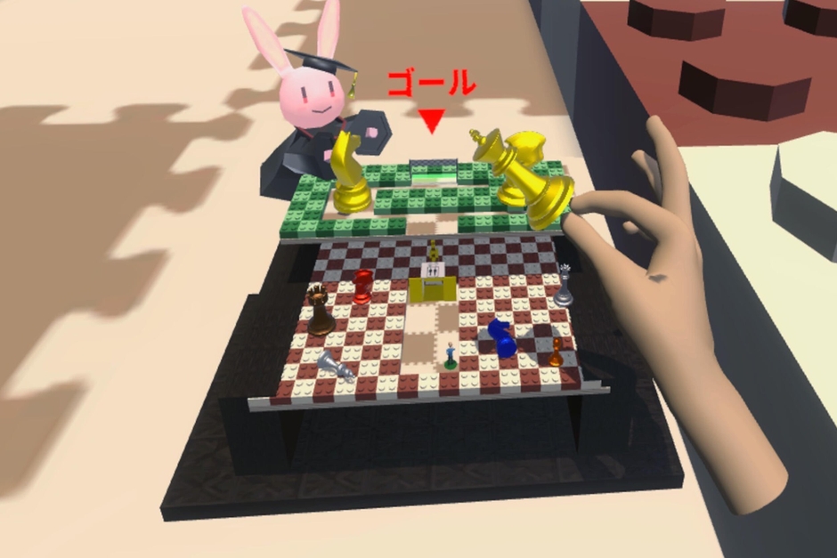 ヘッドマウントディスプレイには、手に持った迷路板でビー玉を転がす俯瞰視点と、ビー玉となって迷路の中に入り込んだ視点が同時に投影されます。さらに足元は、迷路の傾きを自作の床面傾斜装置で表現し、自分の平衡感覚までも錯覚させられる素晴らしい作品に仕上がりました。