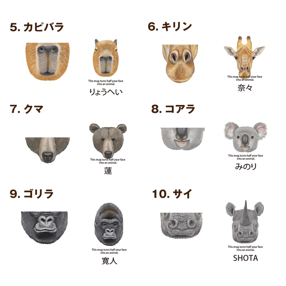 「動物フェイスマグ」は、その名の通り動物の顔がデザインされたマグカップです。特にユニークなのは、飲み物を飲む際にカップに描かれた動物の鼻や口が自分の顔に見えるようデザインされており、使用することでまるで動物に変身したかのような楽しい体験が可能です。さらに、お客様自身の名前を入れるカスタマイズも受け付けており、完全オリジナルのマグカップをお作りすることができます。