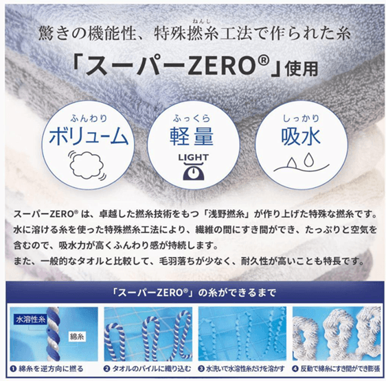 「SUPER ZEROⓇ」という特殊な撚糸工法の糸により、繊維の間にすき間ができたっぷりと空気を含むため、吸収力が高くふんわり感も持続します。毛羽落ちが少なく、耐久性が高いことも特徴。