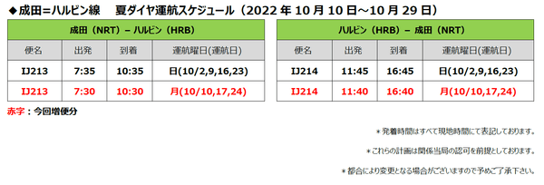 スプリング・ジャパン株式会社(本社:千葉県成田市、代表取締役社長:米澤 章、以下:スプリング・ジャパン)は、2022年夏ダイヤの成田=ハルビン線を以下の通り増便し、本日より販売を開始しております。同期間中の運賃およびダイヤの詳細につきましてはスプリング・ジャパン公式サイトをご覧ください。