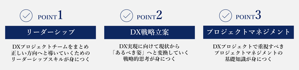 本プログラムでは、DX推進リーダーに必要な 「リーダーシップ」「DX戦略立案」 「プロジェクトマネジメント」の3点を統合的に実行・推進できる力を身につけることができます。