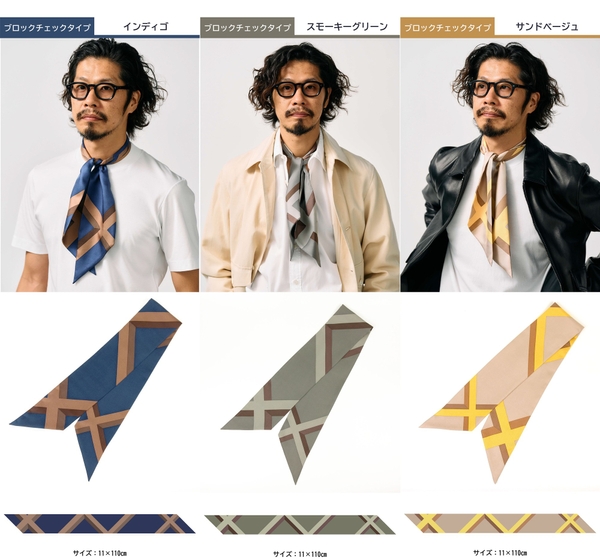 ちなみに、ファッションのカジュアル化が進んだ反動か、装いにドレス度をプラスするワンポイントとして、世界的にも薄手の巻き物はトレンドの気配。人気スタイリスト四方章敬氏と、アラ商事の旗艦ブランド「Earldom(アールダム)」の3弾目のコラボとして作成した今回の2タイプのネッカチーフは、そんなトレンドを先取りするのにも絶好のアイテムと自負しております。