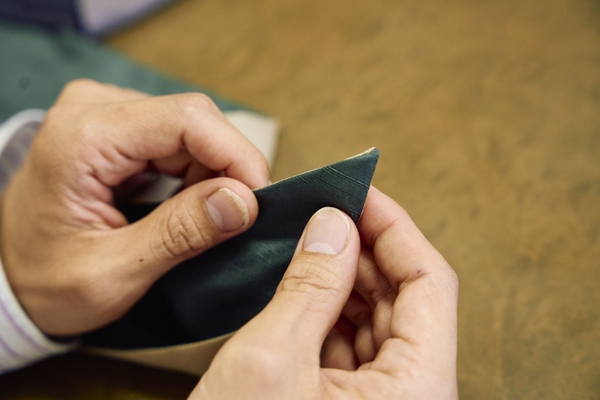 両端が45度のバイヤス裁断で、剣先がキリッととがって真っすぐなこのデザイン。これを袋縫いするのは、じつは至難の技。とくに「リバーシブル」タイプは、表と裏の生地のテンションが異なります。それを真ん中できっちり縫い合わせるのに、縫製工場の職人さんには大変な苦労を強いてしまいました。オーソドックスには見えますが、技術力が問われる縫製で仕上ったネッカチーフ。ぜひその渾身のクオリティを、手にとって実感してくださいませ。