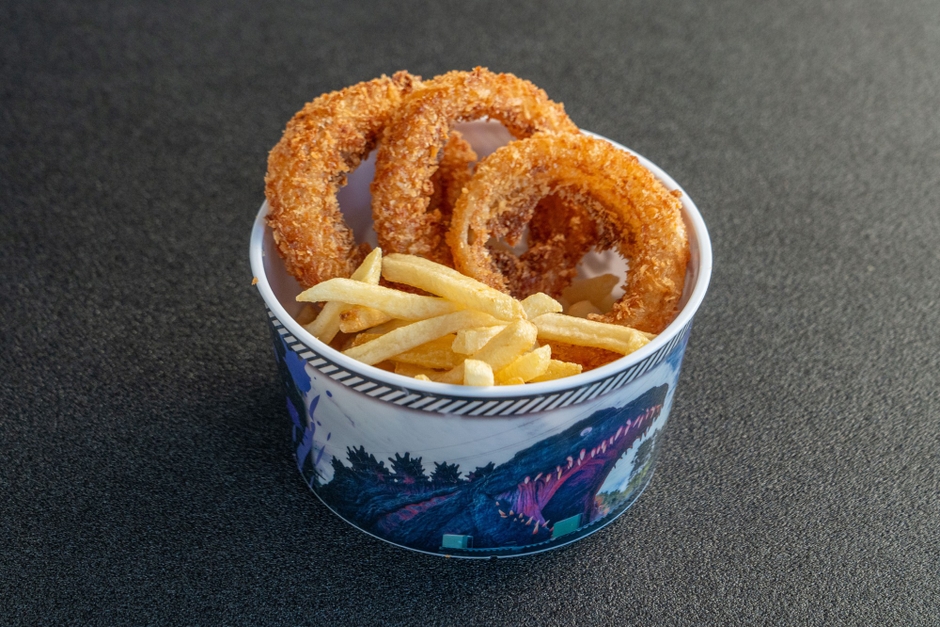 生まれ変わったコラボメニューのコンセプトは「大迫力」。映画『ゴジラVSモスラ』をイメージし、2体の怪獣を黒と白のカレーで表現した、2~3人前の超ボリューム「ゴジラVSモスラ W怪獣カレー」や、ゴジラ最大のライバルであるキングギドラを、黄金に輝く親子丼に3本のチキンカツとトルティーヤで表現し、見た目も胃袋にも大迫力の「胃袋破壊!キングギドラ丼」、ゴジラの禍々しい黒をイカ墨で表現し、唐揚げトッピングでゴツゴツ感とボリュームを増加させた「ゴジラ和風ブラックうどん」など、怪獣たちをさまざまな食材や料理で表現した、迫力満点のメニューが登場します。さらに、テイクアウトメニューも充実。「ゴジラ迎撃作戦」の巨大ゴジラがデザインされたオリジナルバケツに、オニオンフライとフライドポテトを満杯にして提供する「ゴジラバケツ」は家族みんなで楽しめるおススメテイクアウトメニュー!その他、片手で食べられるゴジラスイーツや新デザインのドリンクボトルも販売いたします。