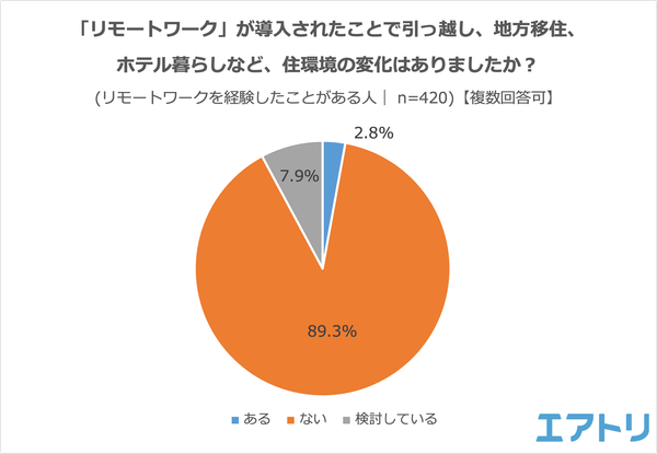 リモートワークを経験している人の中で、住環境の変化があったかを聞いたところ「ない」と回答した人が 89.3%、「ある」が2.8%、「検討している」は7.9%といった結果になりました。実際に住環境の変化があった人は1 割以下にとどまりました。