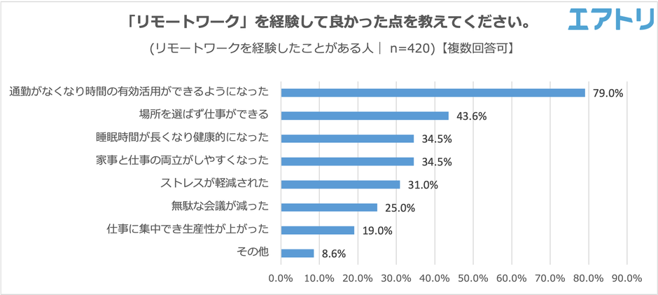 最も多かったのは、「通勤がなくなり時間の有効活用ができるようになった」(79.0%)、次いで「場所を選ばず仕事ができる」(43.6%)、「睡眠時間が⻑くなり健康的になった」(34.5%)、「家事と仕事の両立がしやすくなった」 (34.5%)、「ストレスが軽減された」(31.0%)と続く結果となりました。