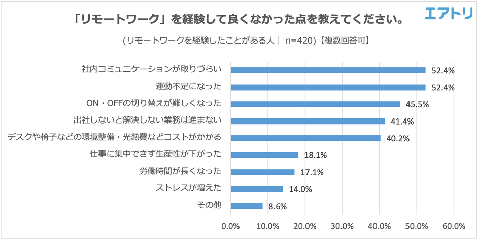 同率で「社内コミュニケーションが取りづらい」「運動不足になった」が 52.4%と最も多く、次いで「ON・OFF の切り替えが難しくなった」(45.5%)「出社しないと解決しない業務は進まない」(41.4%)「デスクや椅子などの環境整備・光熱費などコストがかかる」(40.2%)といった順になりました。
