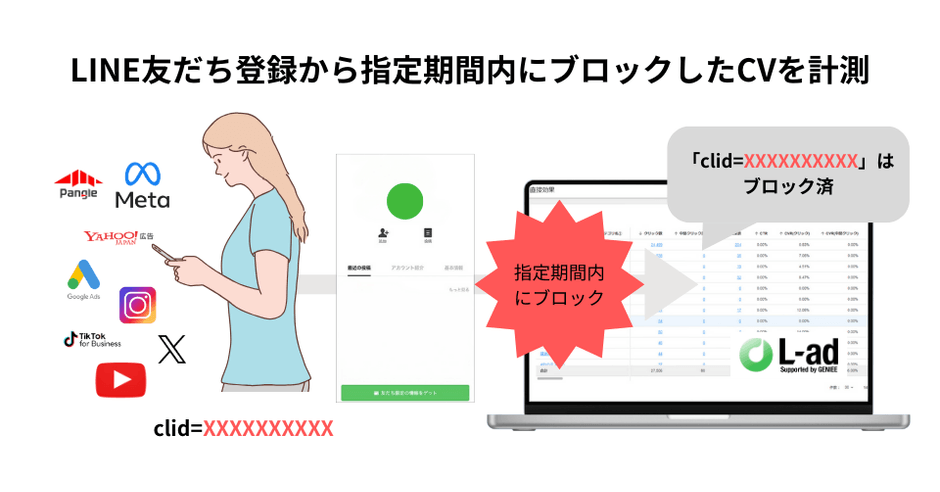 LINE友だち追加計測ツール「L-ad」が、LINE友だち追加後、任意で指定した期間内にブロックされたユーザーを計測&反映することが可能になりました。