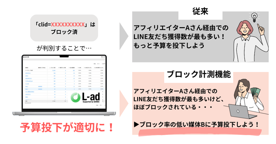 従来「L-ad」が有していたブロック計測機能は、友だち追加後24時間以内にブロックされたユーザーのみを計測していましたが、アフィリエイト施策には「〇〇時間以内にブロックされた友だち追加は成果対象外」となる場合があります。