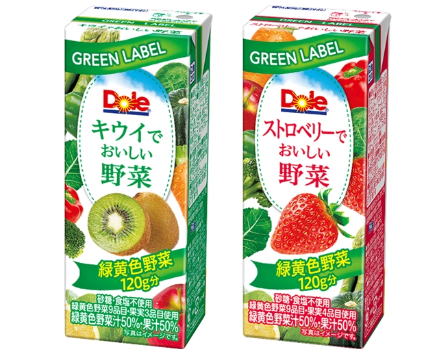 『Dole(R) GREEN LABEL キウイでおいしい野菜』『Dole(R) GREEN LABEL ストロベリーでおいしい野菜』『Dole(R) GREEN LABEL』シリーズは、世界の産地から選んだ果実で仕立てた、おいしく飲める野菜飲料です。野菜の中でも摂取意向の高い、緑黄色野菜を120g分使用しています。