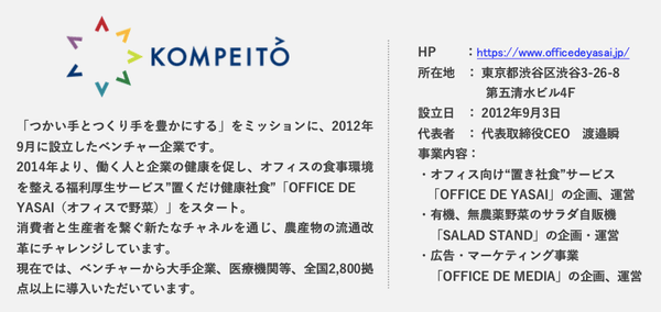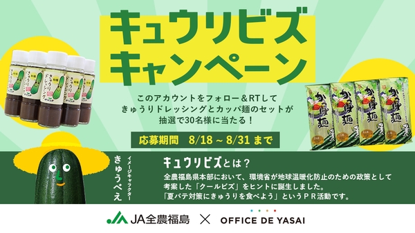 株式会社KOMPEITO(東京都渋谷区、代表取締役 渡邉瞬)が展開する“置くだけ健康社食”「OFFICE DE YASAI (オフィスで野菜)」は、全国の地方自治体や各地のJA 、JA全農と連携し、「OFFICE DE YASAI」専用冷蔵庫や専用アプリ「YASAI PAY(ヤサイペイ)」にて、地方の特産品の販売や、無料サンプリングを行う地方応援企画を月替りで実施しております。8月には、1週目〜3週目にかけてJ A全農福島が推奨している「キュウリビズ」の活動認知のために福島県産きゅうりのオフィスサンプリングとTwitterキャンペーンを実施いたしました。