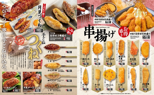 串揚げは玉ねぎ、オクラ、人気の紅生姜などの野菜、豚ロース、豚ヒレ、鶏ささみ大葉などの肉系、その他魚も含め全12種類。ソースは、サラっとしたバランスのよい、まろやかな「大阪なにわ名物の串かつソース」を使用。5本盛り699円(税込768円)10本盛り1,350円(税込1,485円)