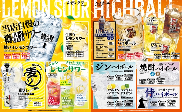 定番のレモンサワーは「樽ハイ倶楽部のレモンサワー」に一新。レモンとお酒の味わいバランスがよく、飲み飽きないレモンサワーを導入。その他、よりレモンを感じるスッキリした「レレレレモンサワー」シリーズも、ざくろやカルピスなど4種類を展開、また麦焼酎レモンサワー「麦ソレ」など、色々お楽しみ頂けます。