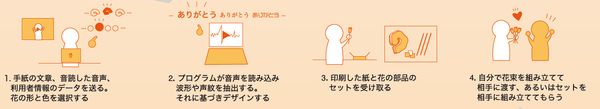 「monka」は音読された言葉と、声紋を元にプログラムが花束型メッセージカードのデザインを自動生成し、オンデマンドプリントを活用することで一点ずつ作成する事を想定したアイデアの作品です。今回配布する母の日グッズとしての「monka」は、予め「お母さん いつもありがとう」とメッセージをプリントした花束型メッセージカードをペーパークラフト化し、当社が竹尾と共に生産し配布するものです。