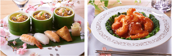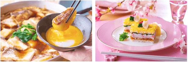 右:春らしさいっぱい、海鮮寿司ケーキ。桜でんぷを混ぜ込んだシャリの押し寿司。海老やサーモンの赤、錦糸卵の黄色、絹さやの緑で、目でも春を感じるメニューです。