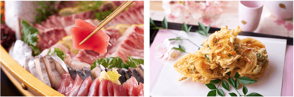 左:定番人気の握り寿司に、春らしい吹き寄せちらし寿司をプラス。小さな竹筒の器の中に、吹き寄せの名の通り、色とりどりの具材があしらわれた、目でも春を楽しめる一品をお見逃しなく。