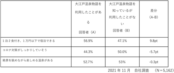 宿泊料金、安全面を心配されている方も多いコロナ対策、基本価値である温泉の3つの項目で、利用者と非利用者のスコアに差がなく、双方の利用意向を同程度に喚起した項目は
