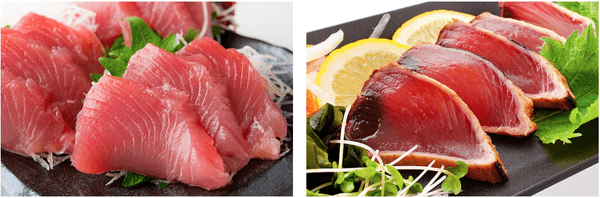 右:こちらはさらに宿から近い、地元・串本港で水揚げされたカツオ。フィリピン沖から黑潮にのって北上し、日本近海 にやってくる春のカツオを「上りカツオ」と称し、さっぱりとした赤身の美味しさを楽しむことができます。上りカツオ で春の訪れを感じる、というお客様が心待ちにするメニューです。
