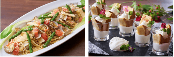 左:春野菜とあさりなど旬の食材をたっぷり使ったパスタ。紹興酒と葱生姜醤が隠し味の、シンプルながら旨味たっぷりのパスタです。