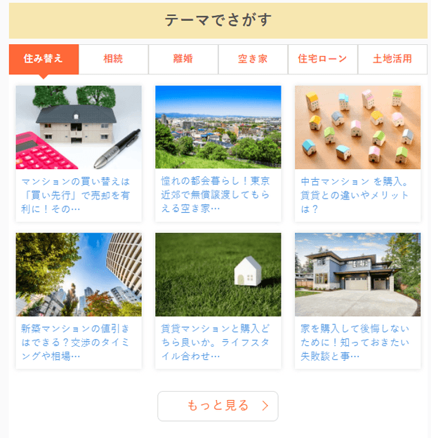 マンション・戸建て・土地などの物件種別や、住み替え・離婚・相続などテーマごとに記事を探しやすいようにデザインし、それぞれのテーマでよく読まれている記事が分かりやすくなりました。