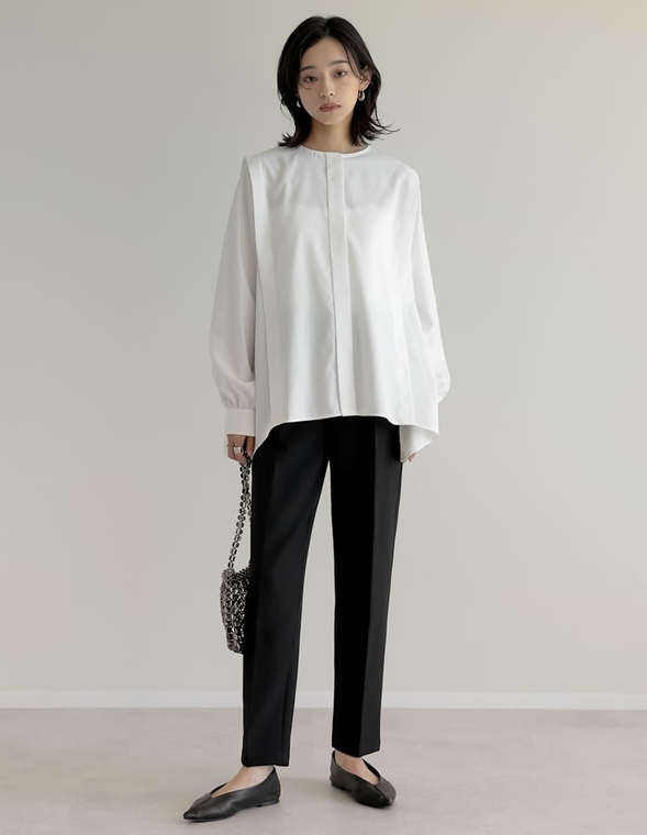 程よくゆとりのあるサイズ感ですが、スタイル良く見えるタックの入れ方や、きれいめに着こなせるネックデザインに注目。