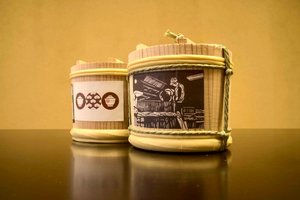 お土産に石井味噌の2種類の味噌の詰め合わせを持ち帰ることができます。界 松本オリジナルラベルと石井味噌で用意しているラベル、全5種類の中からお好きなものを選び貼り付けます。樽の中には一年味噌、三年味噌の2種類が入っており、旅が終わった後、ご家庭でも味わえます。