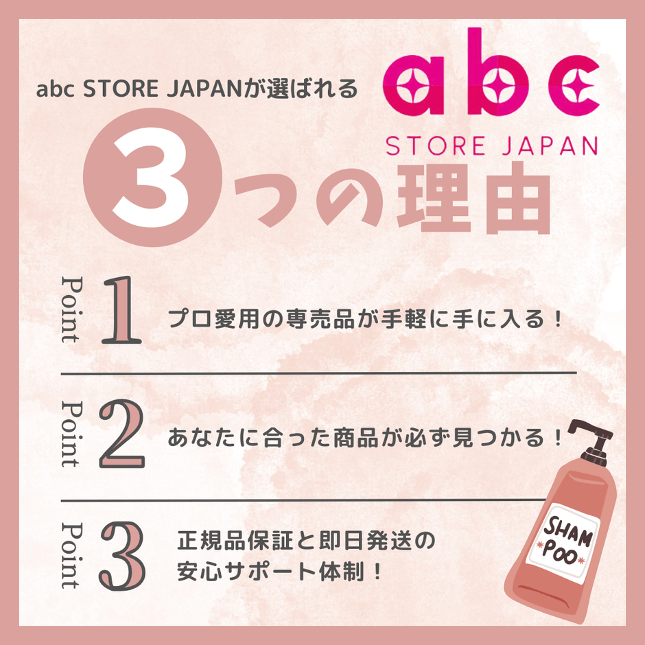 『abcSTOREJAPAN』では、美容サロン専売のプロフェッショナルなアイテムを、どなたでも手軽に購入可能!普段はサロンでしか手に入らない高品質なスキンケアやヘアケア商品を、自宅で使えるのが最大の魅力です。プロが認めた実力派アイテムだから、使用感や効果が違います。「サロンの仕上がりを自宅でも体験したい」という方にぴったりの通販サイトです。わざわざサロンに足を運ぶ手間が省けるのも大きなメリットです!