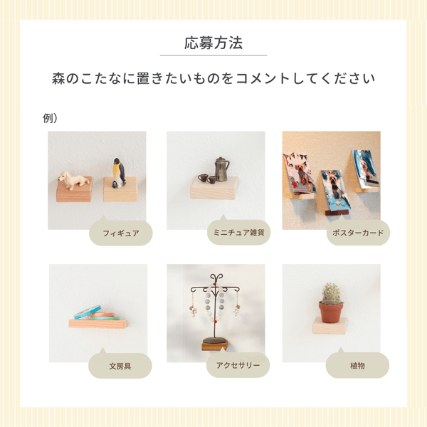 キャンペーンの該当投稿(https://www.instagram.com/p/CpOo-ppJYLk/)に「森のこたなに置きたいもの」をコメントしてください。
