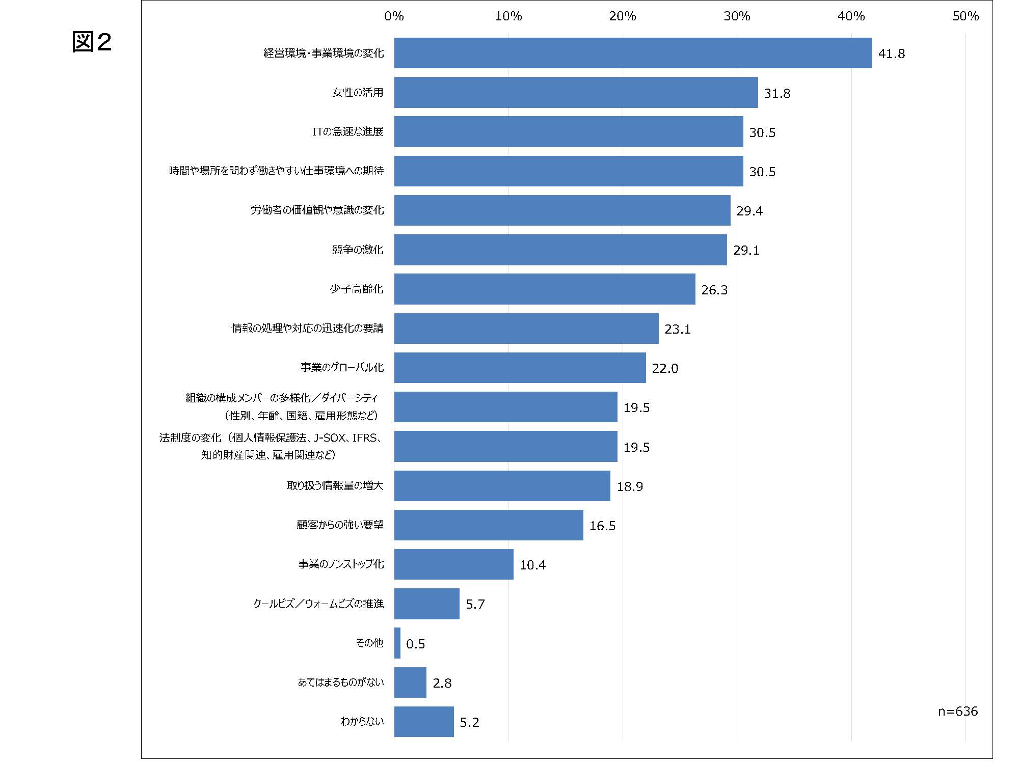このほかに、「ITの急速な発展」、「時間や場所を問わず働きやすい仕事環境への期待」の両項目を加えた4項目が3割を超えた。