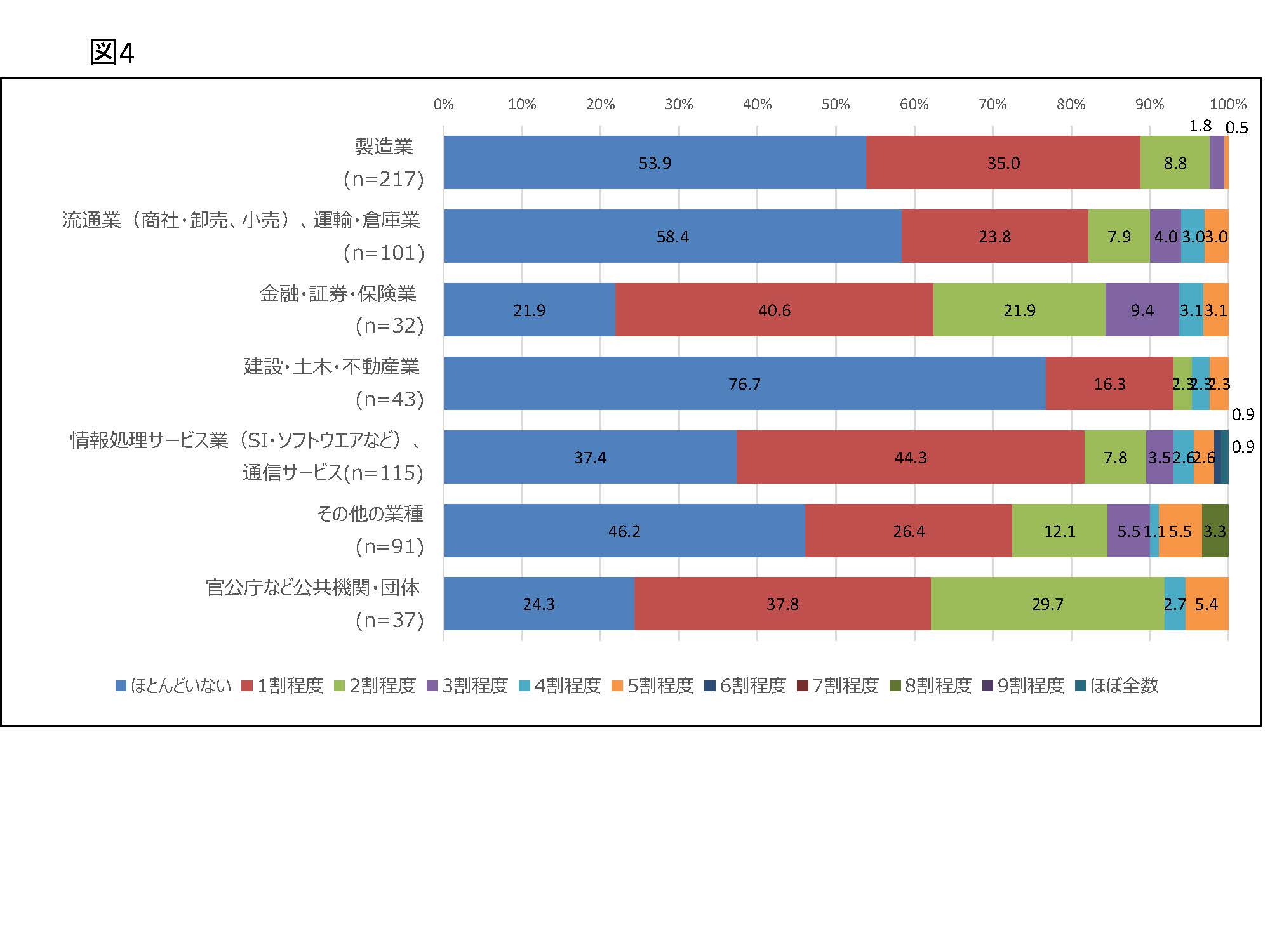 本調査では、「女性役職者比率」についても尋ねた(図3)。女性役職者が「ほとんどいない」と回答したのは、1,000人以上の企業でも37.8%と3分の1を超えており、100人から999人の中堅企業でも52.3%と半数を占める。99人以下の企業では64.4%であり、企業規模が小さいほど女性役職者比率が低いという結果だった。業種別に「女性役職者比率」をみると、「金融・証券・保険業」、「官公庁など公共機関・団体」で高く、「建築・土木・不動産業」では低い(図4)。
