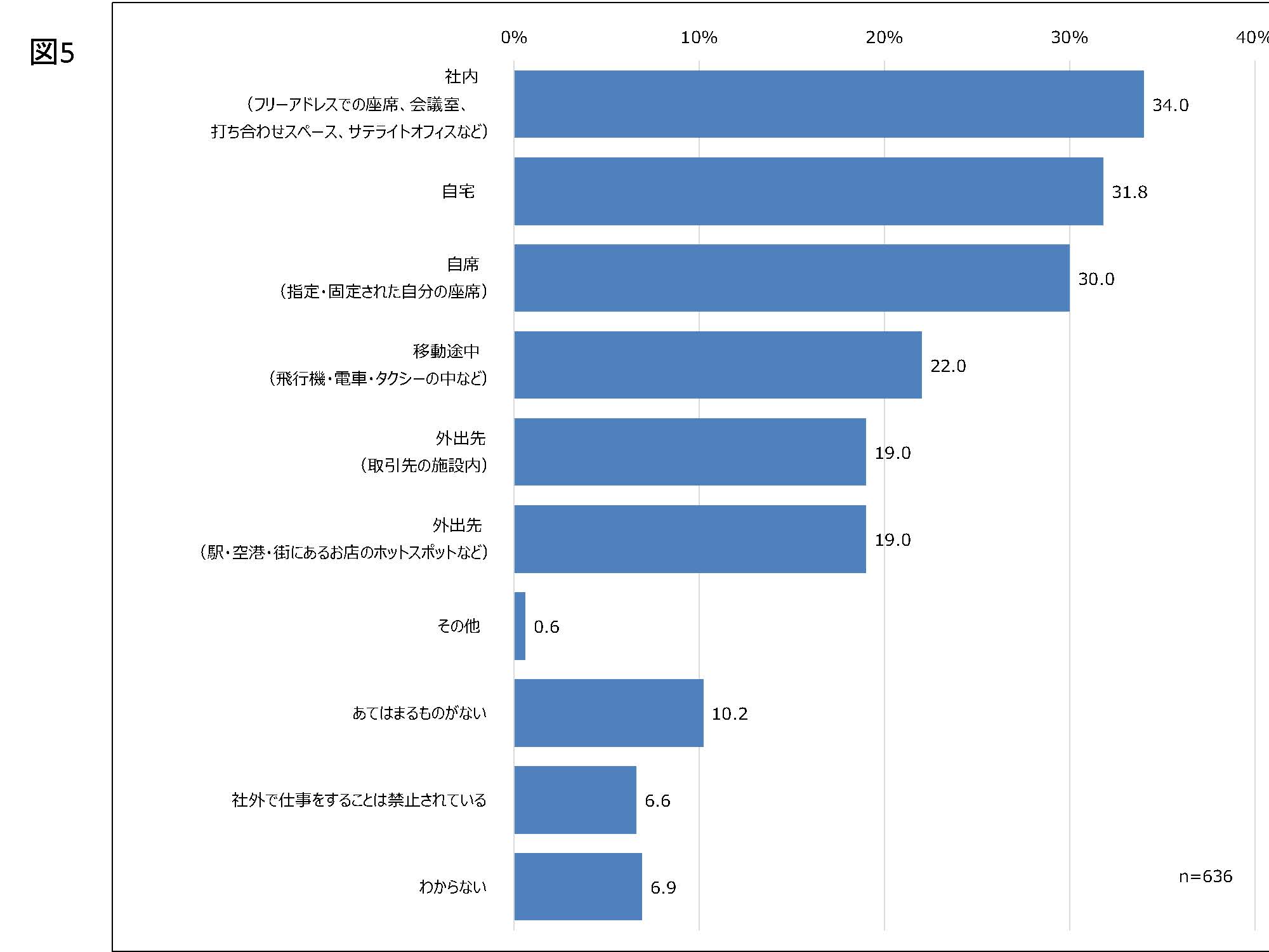 図5 勤務先の従業員が仕事をする場所で、今後利用の拡大が見込まれる場所(複数回答)