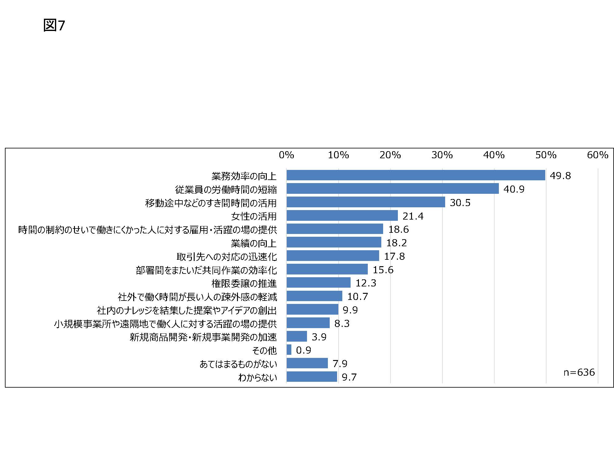 このように企業がワークスタイル改革に取り組んでいる中で期待しているプラス効果として、「業務効率の向上」が49.8%でほぼ半数(図7)。次いで、「従業員の労働時間の短縮」(40.9%)、「移動途中などのすき間時間の活用」(30.5%)と続く。経営の効率化が上位に並んだ。