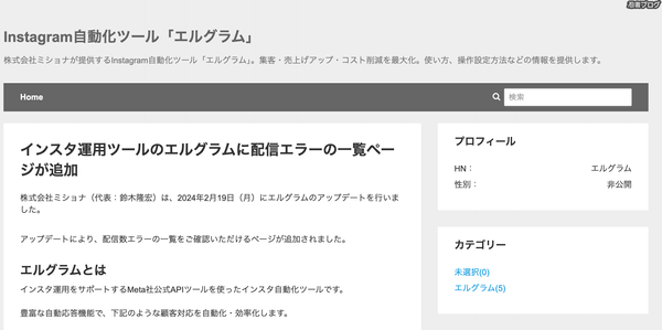インスタ自動化ツール「エルグラム」の機能や料金、アップデート情報などを紹介するブログを忍者で開設します。