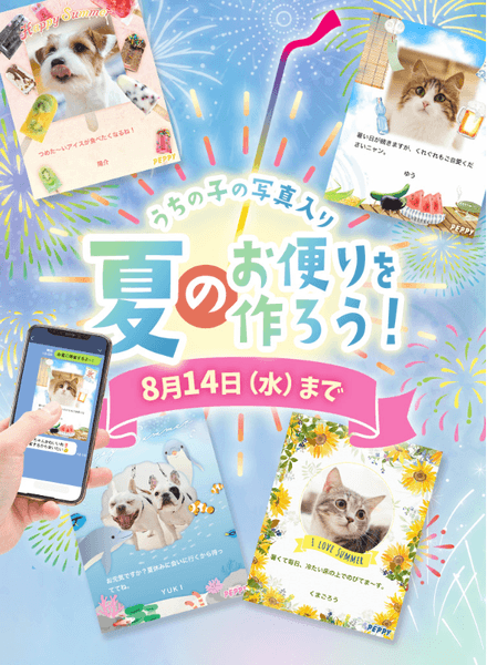 「暑中見舞い」とは、1年で一番暑い季節に普段なかなか会えない親族や友人、お世話になっている方々へ健康を気遣う夏の挨拶状です。このイベントでは、かわいい愛犬・愛猫のお写真を使って季節の挨拶カードを無料で作ることができます。