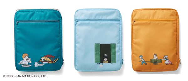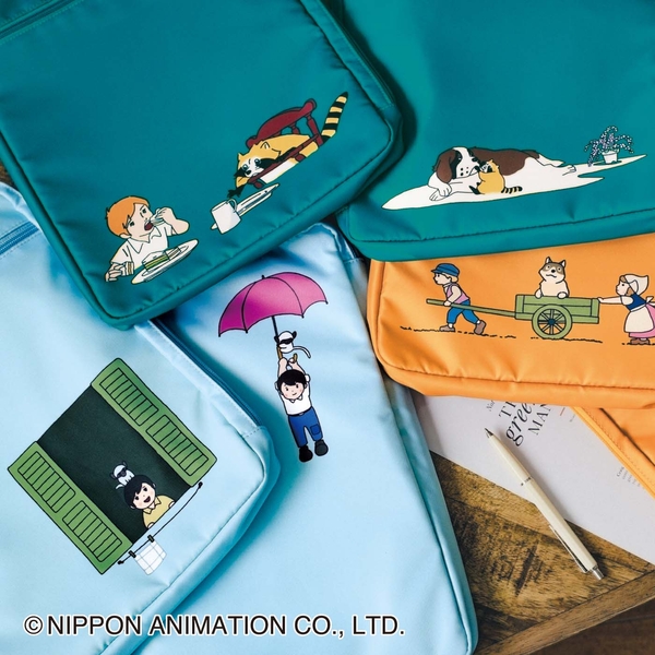 アニメのエンディング曲と共に映し出されていた愛くるしいキャラクターたちの姿をプリントしたA4ファイルポーチです。裏と表で違うシーンをプリントしています。L字に大きく開くダブルファスナー仕様なので、中身の出し入れがスムーズです。ペンやファイルなどを整理しつつ、ひとまとめにして持ち歩けます。デザインは、〈あらいぐまラスカル〉〈母をたずねて三千里〉〈フランダースの犬〉の3種類。