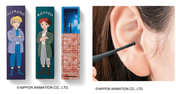 「ロミオの青い空」の物語に出て来る煙突掃除にちなんで、快適なタッチで上手にお掃除できる耳かきを作りました。ボディーは、ほどよくしなるエラストマーゴムで、両サイドにやわらかブラシとらせん式耳かきが付いています。使用後は水洗い可能な清潔仕様です。ロミオとアルフレドを描いた箱入りなので、プレゼントにもおすすめです。