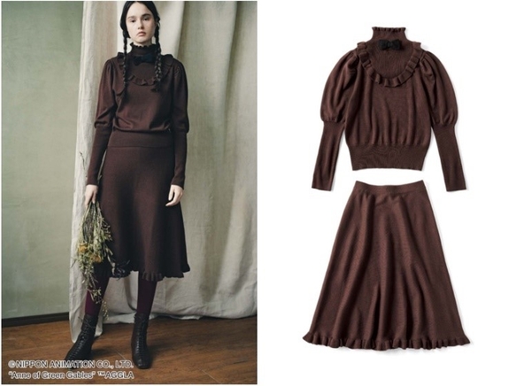 アンが物語の中でついに手にしたパフスリーブワンピースをセットアップで再現しました。ほどよい厚みのあるニット素材で、少しワインを思わせるようなブラウンカラーが大人っぽい雰囲気です。上下別々にお手持ちのアイテムと組み合わせて楽しむこともできます。